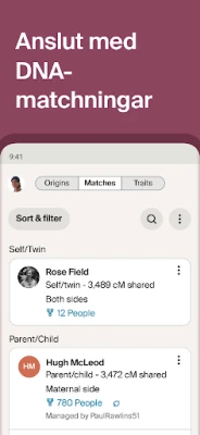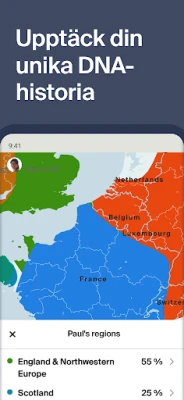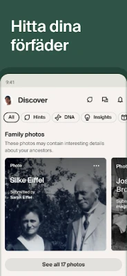 Dyk djupare med tillgång till en omfattande samling av över 30 miljarder registeruppgifter, foton och arkivmaterial, tillgängligt via ett kostnadsfritt provabonnemang eller fullvärdig prenumeration. Ancestry-appen levererar dynamiska upptäckter direkt till dig, vilket gör det enkelt att utforska nya ledtrådar om dina förfäder. Förstärk din resa genom att aktivera ditt AncestryDNA-kit direkt i appen. Se dina etnicitetsresultat, utforska DNA-matchningar och jämför era genetiska band. Genom att integrera dina DNA-insikter med ditt släktträd får du en enastående förståelse för din unika släkthistoria, inklusive hur dina gener påverkar över 35 olika personliga egenskaper – från fysiska attribut till näringsupptag och utseende.