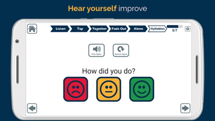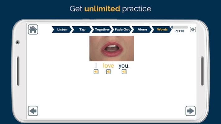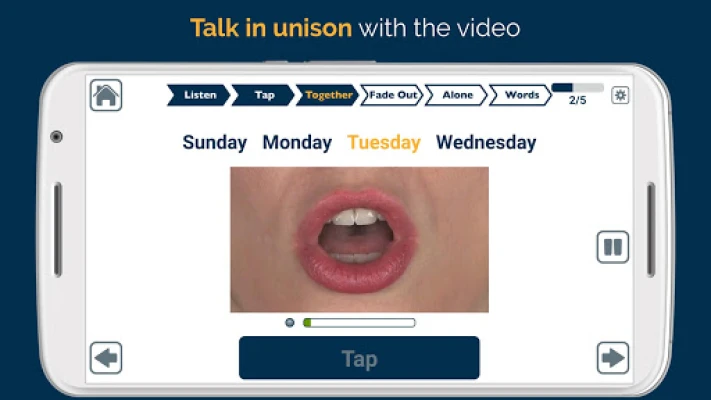 Upplev en responsiv och distraktionsfri träningsmiljö, fylld med högkvalitativa videor framtagna av SpeakinMotion. Tekniken bakom VAST (Video-Assisted Speech Therapy) använder innovativa videomodeller som tydligt visar munrörelser, ljud och andra visuella ledtrådar. Användaren tittar, lyssnar, följer rytmen och talar unisont med modellen. Gradvis fasas ljudstödet ut, medan de visuella signalerna fortsätter att vägleda, innan man slutligen talar helt självständigt med enbart visuell hjälp. Apraxia Therapy anpassar sig efter din takt med tre olika hastigheter och varierande svårighetsgrader, vilket säkerställer en optimal och individuell upplevelse. Dessutom spelas talet in automatiskt för självvärdering och kan enkelt delas med terapeuter eller anhöriga via e-post, vilket förstärker terapeutisk kontinuitet.