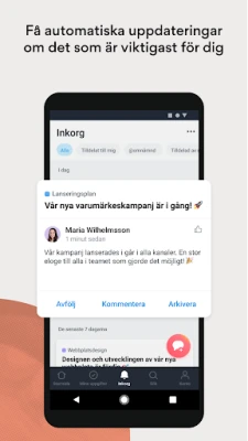 Främja en sömlös och uppkopplad arbetsmiljö. Asana gör det enkelt att kommunicera med teamkollegor genom att direkt gilla, kommentera och bifoga filer till uppgifter, vilket säkerställer att alla är synkroniserade. Du får dessutom automatiska uppdateringar skickade direkt till din inkorg om de projekt och framsteg som är mest relevanta för dig. Fördjupa er i Asanas omfattande ekosystem och upptäck ännu fler möjligheter: få en överblick över alla pågående initiativ med Portfolior, anpassa informationen med Anpassade fält, visualisera beroenden i projekt med Tidslinjen och spåra företagets strategiska mål och milstolpar med Mål.