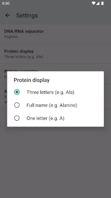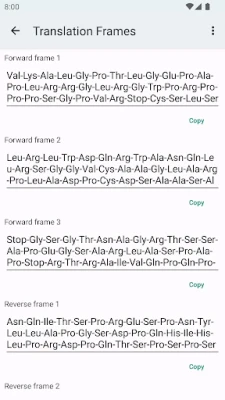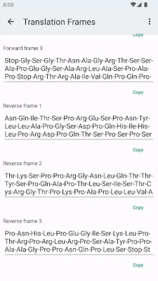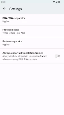 Flexibilitet är nyckeln när det gäller vetenskapliga data. Detta verktyg ger dig full kontroll över hur dina sekvenser presenteras. Anpassa visningen av aminosyror efter dina behov, vare sig du föredrar fullständiga namn som Alanine, den kortare trebokstavsnotationen Ala, eller den mest kompakta enbokstavsnotationen A – allt justerbart direkt i appens inställningar. Dessutom kan du själv välja hur DNA/RNA-sekvenser ska avgränsas, med alternativ som bindestreck, mellanslag eller ingen avgränsning alls. För att ytterligare effektivisera ditt arbete finns smidiga kopieringsknappar under varje fält, vilket låter dig kopiera önskad del – vare sig det är DNA, DNA:s omvända komplement, RNA eller aminosyresekvenser – med ett enda tryck. Du kan även exportera hela analysresultatet till externa applikationer, såsom e-postklienter eller kontorsprogram, för sömlös integration i ditt arbetsflöde.