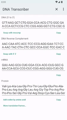 Transkribera och omvänt transkribera DNA↔RNA, beräkna omvänd komplement av DNA, och översätt DNA/RNA till aminosyror/protein. Alla dessa biokemiska verktyg är smidigt samlade på en enda skärm för enkel användning.