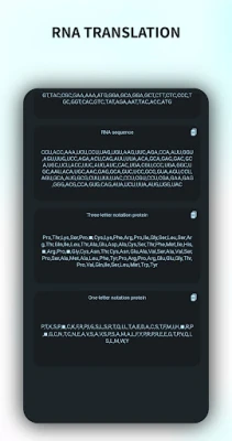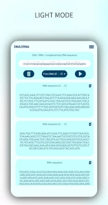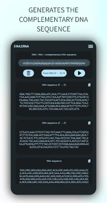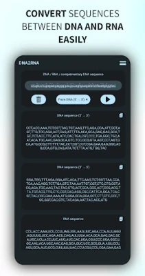 DNA2RNA är en applikation designad för att konvertera sekvenser mellan DNA och RNA. Den kan generera komplementära DNA-sekvenser, utföra RNA-översättning och hantera aminosyrenotation (en/tre bokstäver). Användare kan enkelt dela resultat med andra applikationer och konfigurera kodonavstånd.