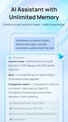 Tanka revolutionerar hur startups samarbetar genom att förse din verksamhet med en kollektiv intelligens och ett proaktivt team av AI-assistenter. Istället för att värdefull information går förlorad eller projekt tappar fart på grund av bristande sammanhang, skapar Tanka en levande, gemensam minnesbank för ditt företag. Genom att sömlöst integrera med dina befintliga verktyg som Slack, Gmail, Outlook, Drive, Notion och Dropbox, bearbetar Tanka enbart det du godkänner. Denna information förvandlas sedan till EverMemOS – en praktiskt taget obegränsad kunskapsbas som Tanka:s agenter kan läsa, skriva till och resonera över, vilket ger er en oöverträffad grund för att arbeta smartare och mer effektivt.