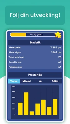 För att hjälpa dig att ständigt utvecklas och finslipa din kompetens presenterar Trivial Svenska detaljerad statistik över dina prestationer. Följ din framgång inom varje kategori, identifiera dina styrkor och svagheter, och sträva efter att bli den bästa frågesportaren du kan vara. Med varje spelomgång förfinar du din allmänbildning och utmanar din egen gräns. Upplev glädjen i att bemästra kunskapens värld och bli en sann expert!